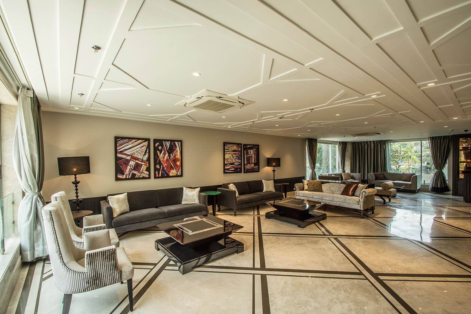 Double height entrance to an intricately designed lobby
